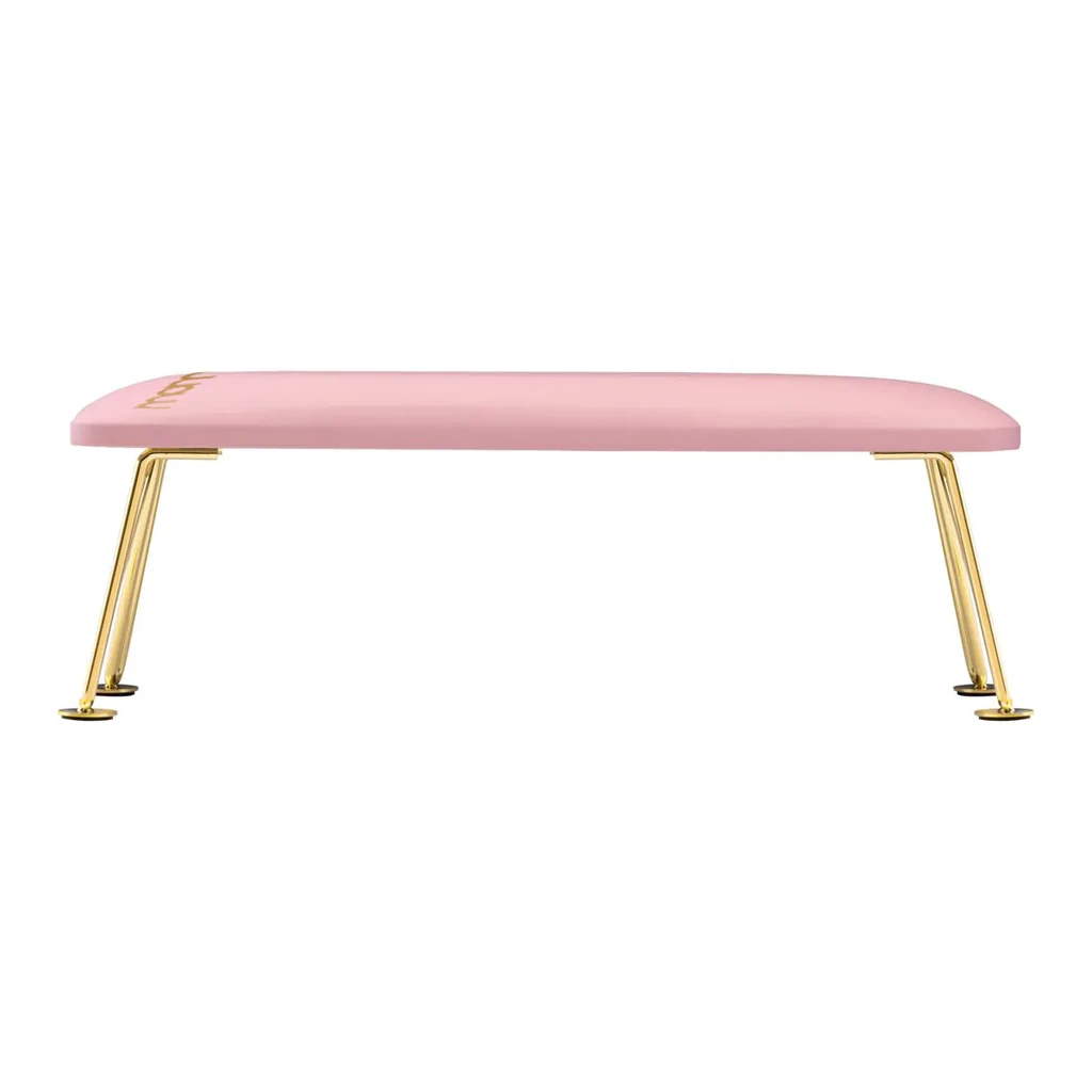 O elegante apoio de pulso é revestido em couro ecológico de alta qualidade, com pernas de aço cromado banhadas em um sutil tom dourado. Sua altura ideal garante um posicionamento ergonomicamente correto para reduzir a fadiga e melhorar o conforto das costas da terapeuta, resultando em um tratamento mais relaxado e agradável para a cliente.